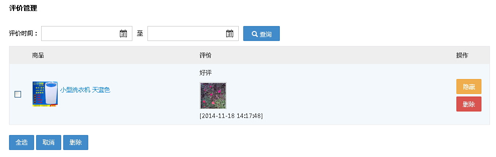 显示买家对商品评价,管理员可以将商品评价隐藏,删除