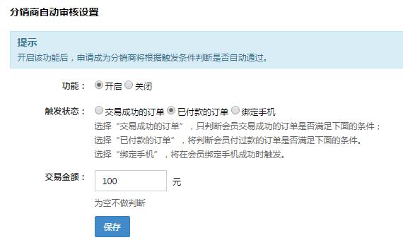 分销商自动审核设置:开启该功能后,申请成为分销商将根据交易金额或交易次数判断是否自动通过。也就是可以设置为达到交易多少金额或者多少比订单,也可以设置交易多少金额与多少订单才能达到自动申请资格,并且新增了“绑定手机”策略。