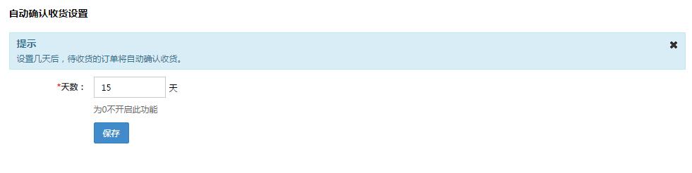 自动确认收货设置:可以设置代收货的的订单在多少天之内自动变成确认收货。