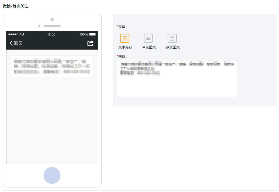 首次关注的类型可以是文本内容、单条图文、多条图文。(单条图文与多条图文设置请查看素材库管理)