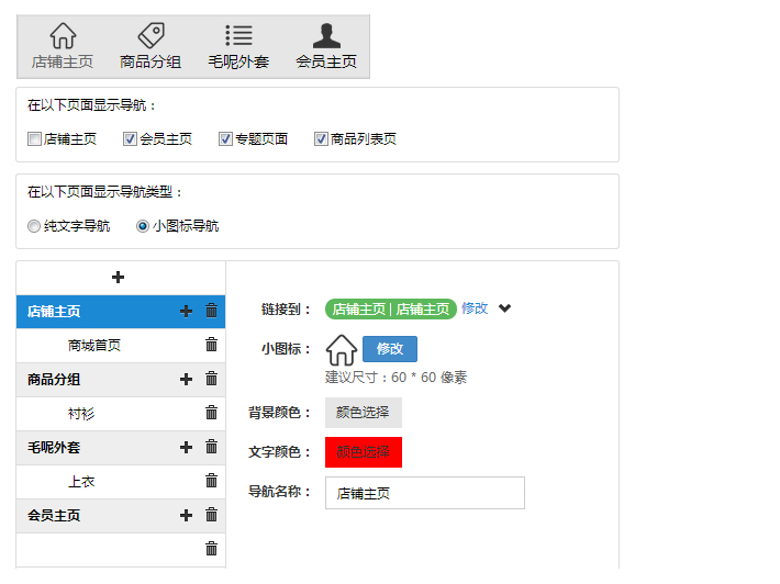 设置店铺导航在哪些页面显示,以及店铺导航显示的名称,店铺导航还能设置二级导航名称及链接,设置店铺的导航按钮,最多只能添加4个导航按钮,可以设置他出现的相应页面和超链接的地址,还可以选择导航类型