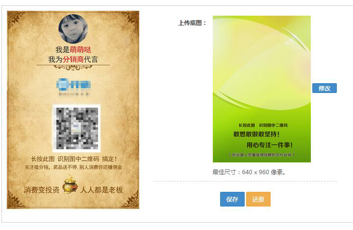 分销名片:设置自己的分销商名片,有默认模板和已设计的几套也可以自己上传自己喜欢的图片做名片的背景。